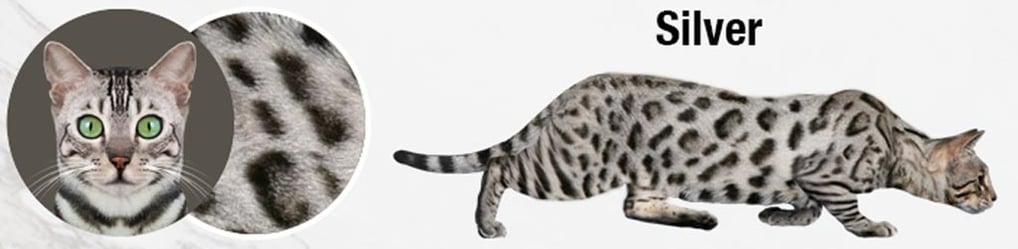 Os gatos Bengal Silver possuem tons diferentes com fundos que variam de cor quase branca (branca não é permitido) a uma cor de aço muito escuro.