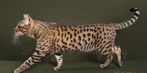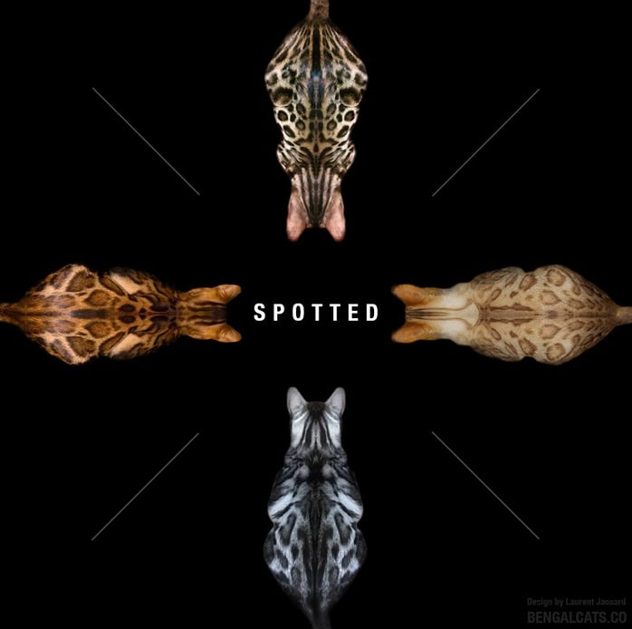 Single-Spotted significa que os pontos são monocromáticos. São apenas manchas sólidas salpicadas como gotículas em um fundo contrastante, semelhante às de gato selvagem como a Cheeta ou gatos manchados não híbridos (Ocicat, Mau egípcio, Shorthair Spotted ou Australian Mist).