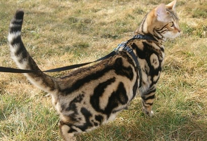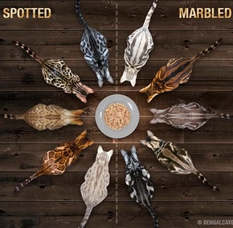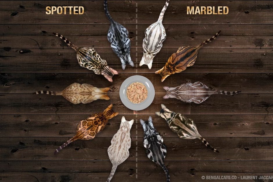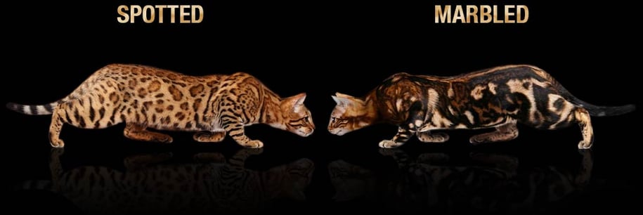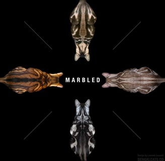 O gato Bengal Marbled possui um padrão horizontal, fluido, aleatório e assimétrico, podendo ter o corpo quase todo de uma única cor, ou marcações bem diferentes, o que o torna muito exótico.