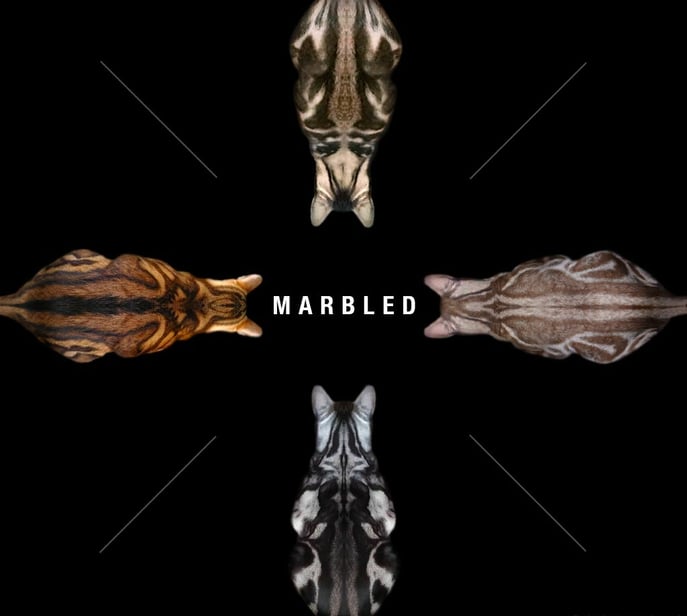 O padrão de pelagem Marbled (marmorizado) é derivado de listras do padrão Spotted Tabby que se espalharam pelo corpo.