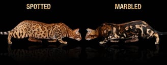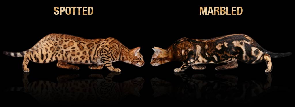 A pelagem do Bengal tem dois padrões básicos, sendo o mais comum o padrão “spotted” que como o próprio nome diz consiste em pontos ao longo do corpo. Também existe o padrão “marble” onde os pontos mais escuros se juntam dando o efeito marmorizado com suas formas irregulares. Tanto o padrão spotted, como o marble são tri-colores, ou seja possuem 3 tonalidades de cor que formam o padrão.