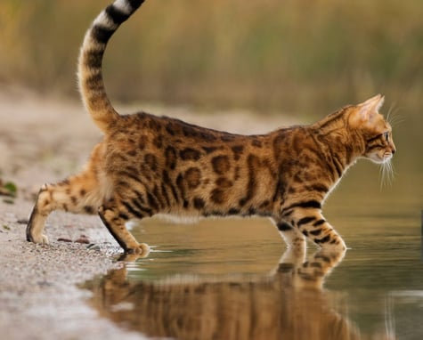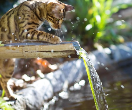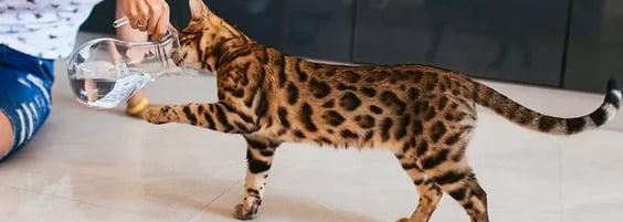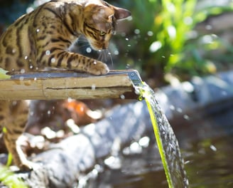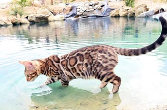 Seu fascínio pela água pode variar de simplesmente observá-la a realmente brincar ou espirrar nela. Alguns Bengals mergulham as patas em suas tigelas de água, brincam com torneiras pingando ou até pulam em banheiras ou piscinas infantis.