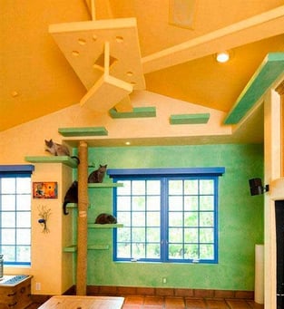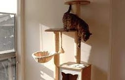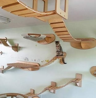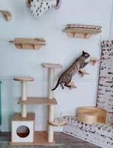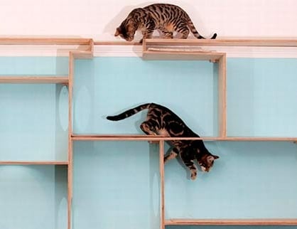Os gatos possuem habilidade natural de pular e escalar, portanto devemos incentivar esse comportamento, focando sempre em objetos que desejamos que eles subam, desincentivando assim, que eles subam em sofás, mesas, pia, cortinas, estantes... Para isso, a instalação de prateleiras ao longo da casa permite que o gato se exercite e que se sinta mais seguro.