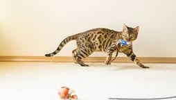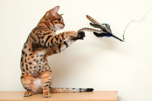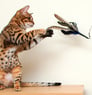 Quando estiver com o seu gato Bengal, lembre-se que ele adora brincadeiras de caça e pode se divertir por muito tempo com você utilizando uma varinha com uma pena ou bichinho atada na ponta. Além de divertido, é muito legal ver o instinto de caça apurado dos Bengals.