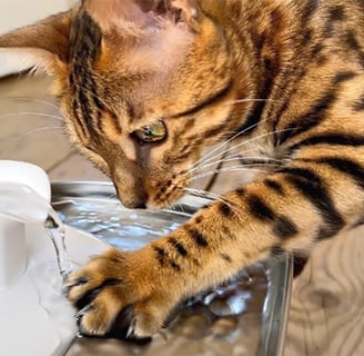 Oferecer água em abundância para nossos Bengals é fundamental para uma correta saúde renal. Bengal necessita de grande quantidade de água diariamente e muitas vezes apenas a ingestão de água que os Bengals bebem da vasilha de água ou fonte de água pode não ser o suficiente.